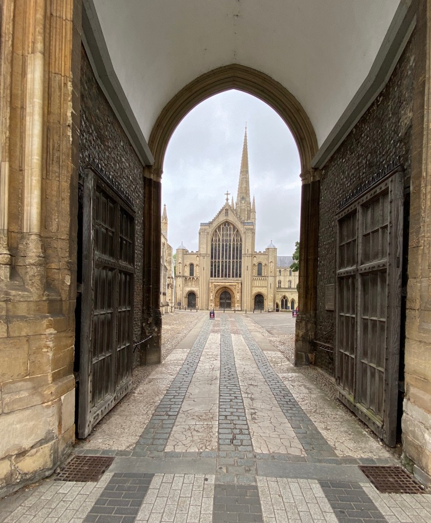 We can see Norwich cathedral from our hotel bedroom window.  Actually, I’m being a little generous.  If we stand by the window and peer sideways we can see the spire over a brick wall and a building or two.  We normally stay in one of the budget hotel chains but, invariably, find ourselves fronting a busy main road, next to a fast food outlet so that we have the aroma of fried food drifting into the hotel.  In a fit of reckless extravagance we had booked into a four star hotel in the centre of Norwich.   It was ideally situated, a stone’s throw from the entrance to the cathedral on the edge of the historic Elm Hill district and had good reviews.